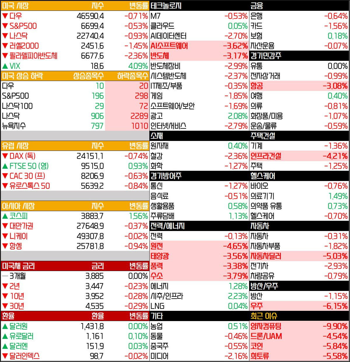 - 기술주, 커뮤니케이션, 임의소비재, 산업재 부문이 부진한 모습을 보였습니다.