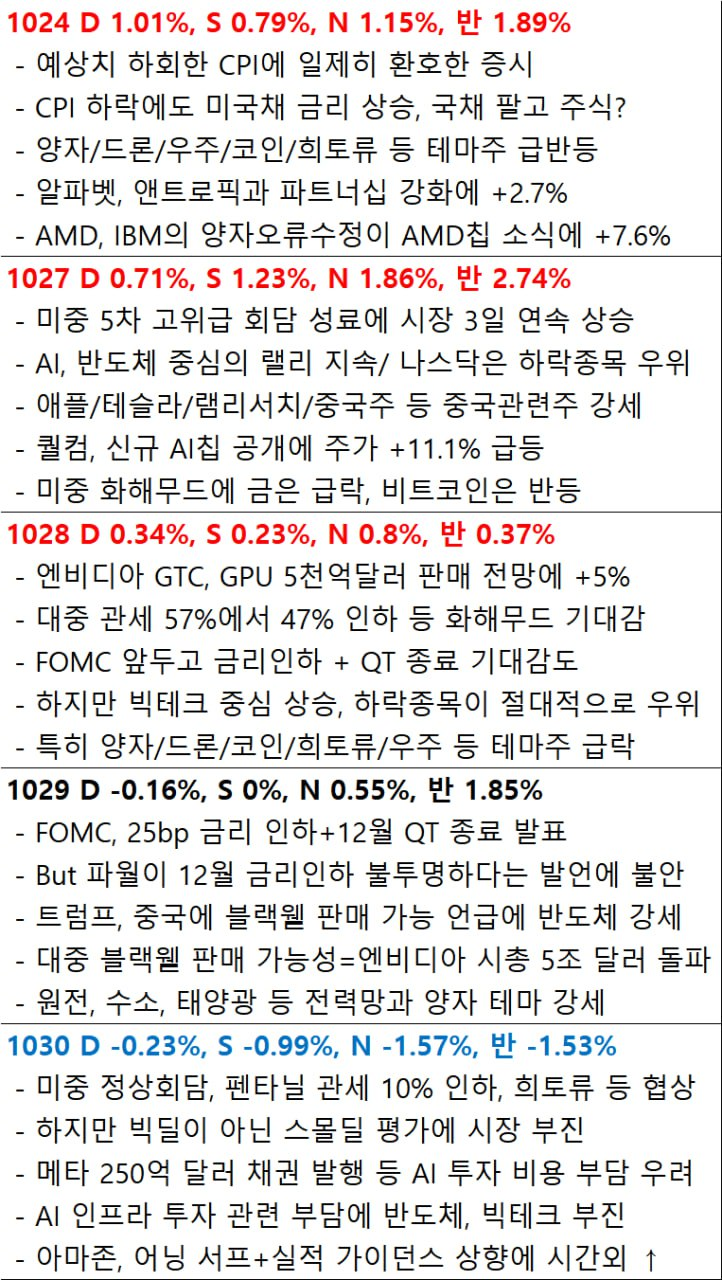 - 트-시 정상 회담과 중국의 희토류 통제 1년 유예, 미국의 펜타닐 관세 10%p 인하 등 미중 협상 타결에도 불구하고 시장은 마이크로소프트와 메타의 실적 후 하락r과 FOMC 여파에 더 크게 반응하며 하락. 특히 지난 며칠간 강세를 보였던 AI 관련 업종이 큰 폭으로 하락. 트럼프가 엔비디아 $NVDA 블랙웰 칩의 중국 수출에 대해 논의하지 않았다는 보도가 발단 혹은 빌미인 듯?