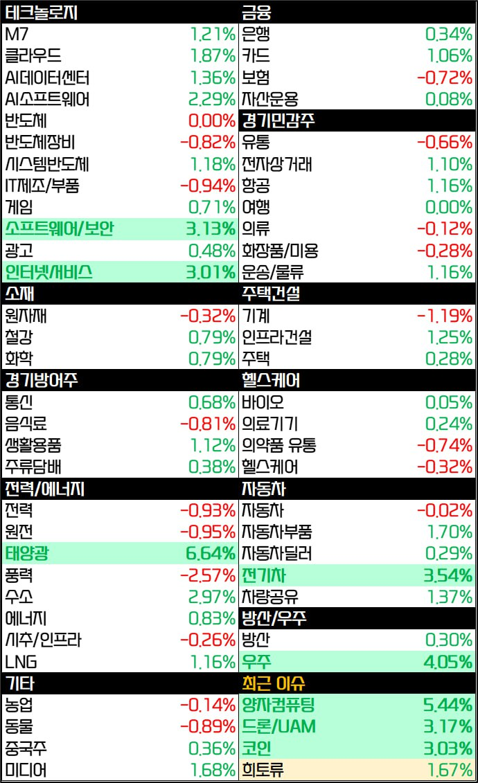 - - 섹터별로는 빅테크 포함 섹터 강세, 나머지 섹터 약세. 금리 민감 및 방어 섹터 약세
