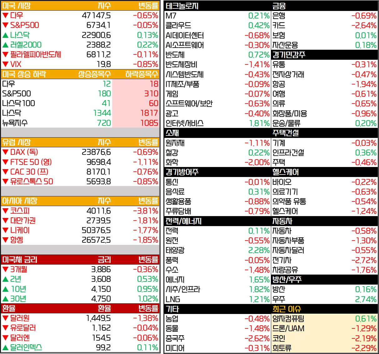 - 전일 미국 증시는 AI 칩 감가상각 논란과 금리인하 기대 약화 속에서도 기술주 저가매수가 유입되며 혼조 마감했습니다.