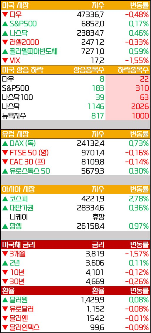 - AI 기대 재부각, 셧다운, 금리 상승 엇갈리며 혼조