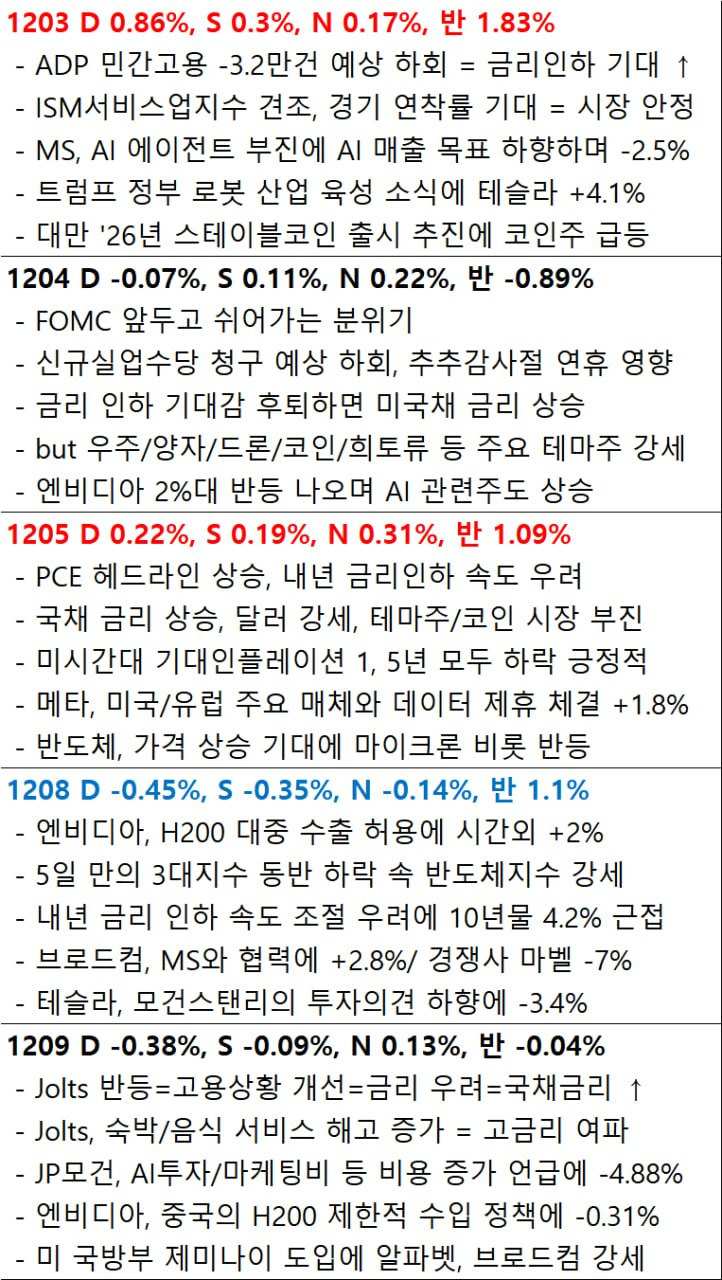 - 엔비디아(-0.31%)는 트럼프가 H200칩을 중국에 수출하는 것을 허용할 것이라고 발표했지만, 중국에서 국산 칩 대체 불가능할 경우데만 허용하고 공공 부문은 금지 조치를 검토 중이라는 소식, 트럼프가 관련 매출의 25%를 제공받는 부분에 부담을 보이며 하락.