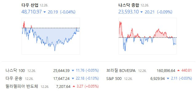 - 12월 26일 미국 증시는 성탄절 연휴 이후 거래 참여가 줄어든 가운데, 연말 차익 실현 매물을 소화하며 보합권 내 소폭 하락 마감했다.