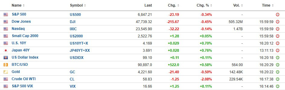 - 넷플릭스(-3.44%)는 워너 브라더스(+4.41%) 인수 합의 소식 이후 트럼프와 규제 당국의 반독점 제재 가능성이 부각되자 하락.