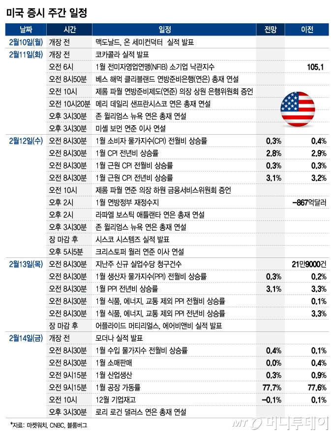 - 도널드 트럼프 미국 행정부의 관세 정책으로 인플레이션 재반등 우려가 고조되고 있는 가운데 미국 증시에서는 이번주 지난 1월 물가지표가 줄줄이 발표된다.