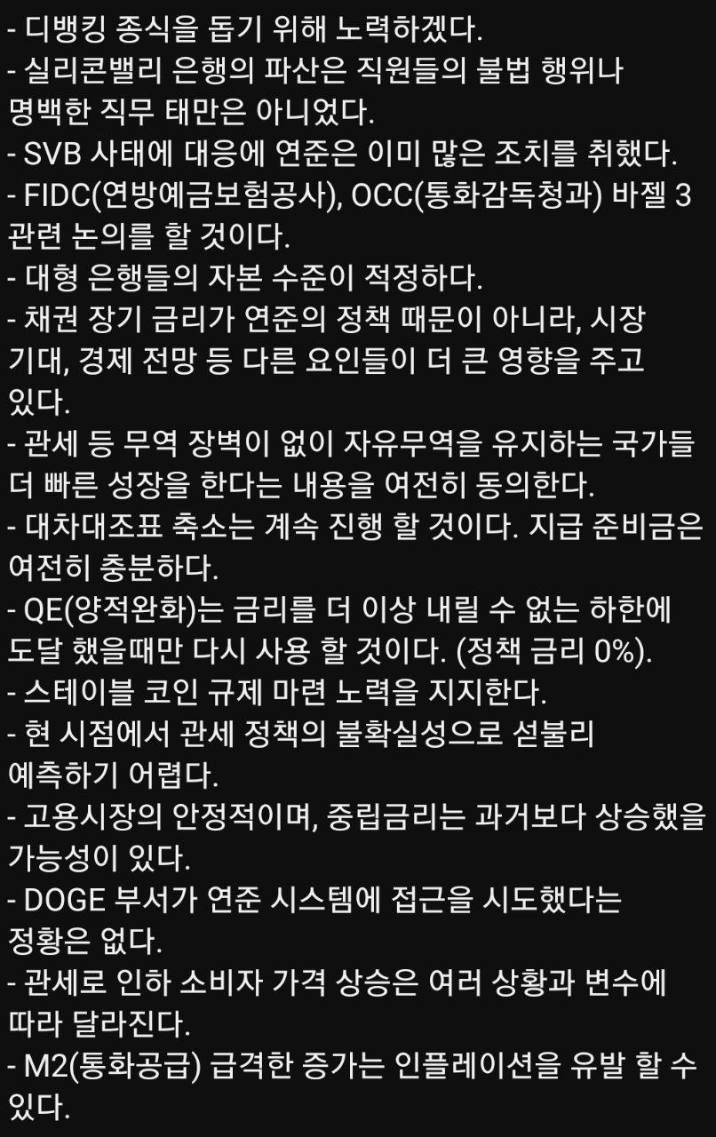 - 질의 응답에서는 고용시장이 예상치 못하게 악화되거나 인플레이션이 예상보다 빠르게 하락할 경우 정책을 완화할 수 있다고 언급.