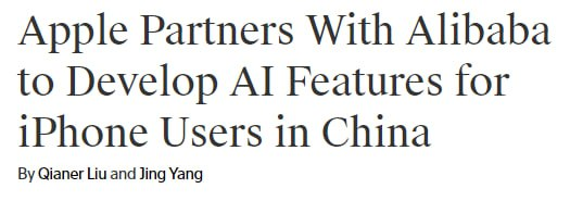 3. 애플과 알리바바가 협력하여 중국 아이폰 사용자를 위한 AI 기능을 개발합니다. 이 문제에 정통한 소식통은 이번 조치가 중국에서의 판매 부진을 타개하기 위한 Apple의 전략의 일환이며 더 매력적인 소프트웨어 기능을 제공하기 위한 것이라고 말했습니다.
