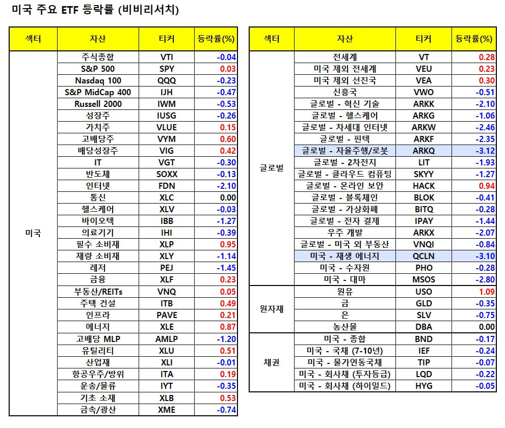 - MS(-0.19%), 아마존(-0.15%), 알파벳(-0.60%)은 자본지출 확대가 지속됨에 따라 실적에 대한 불안 심리가 유입되며 하락.