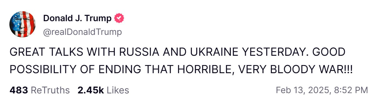 4. 페스코프 러시아 대통령 공보실장은 13일 러시아는 우크라이나 사태와 관련한 협상에서 미국을 주요 대화 상대로 간주하고 있다고 밝혔다. 푸틴과 트럼프가 언제 서로를 방문할지에 대해 이야기하기에는 너무 이르며 푸틴과 트럼프의 만남은 준비하는 데 몇 주 또는 몇 달이 걸릴 것입니다.