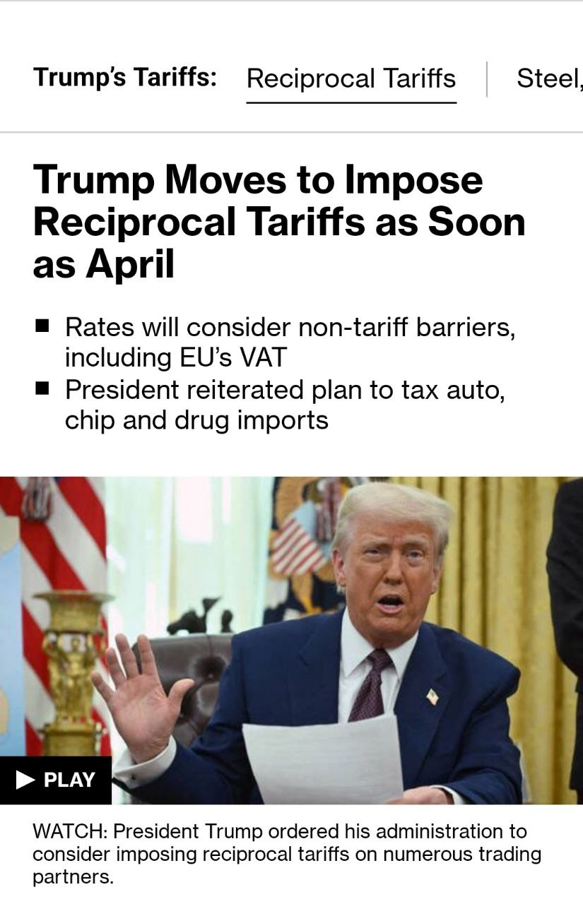 2/14개장전꼭 알아야할 5가지Bloomberg 1) 트럼프 상호관세 4월부터트럼프가 무역 불균형을 바로잡기 위해 교역 국가별로 상호관세 부과를 검토하도록 지시하는 내용의 조치에 서명.하워드 루