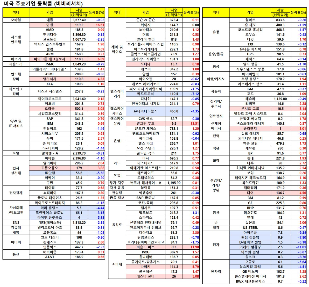 - 그 외 오라클(+3.24%), 팔란티어(+4.58%)등 AI 서비스 관련 기업들의 강세도 특징.