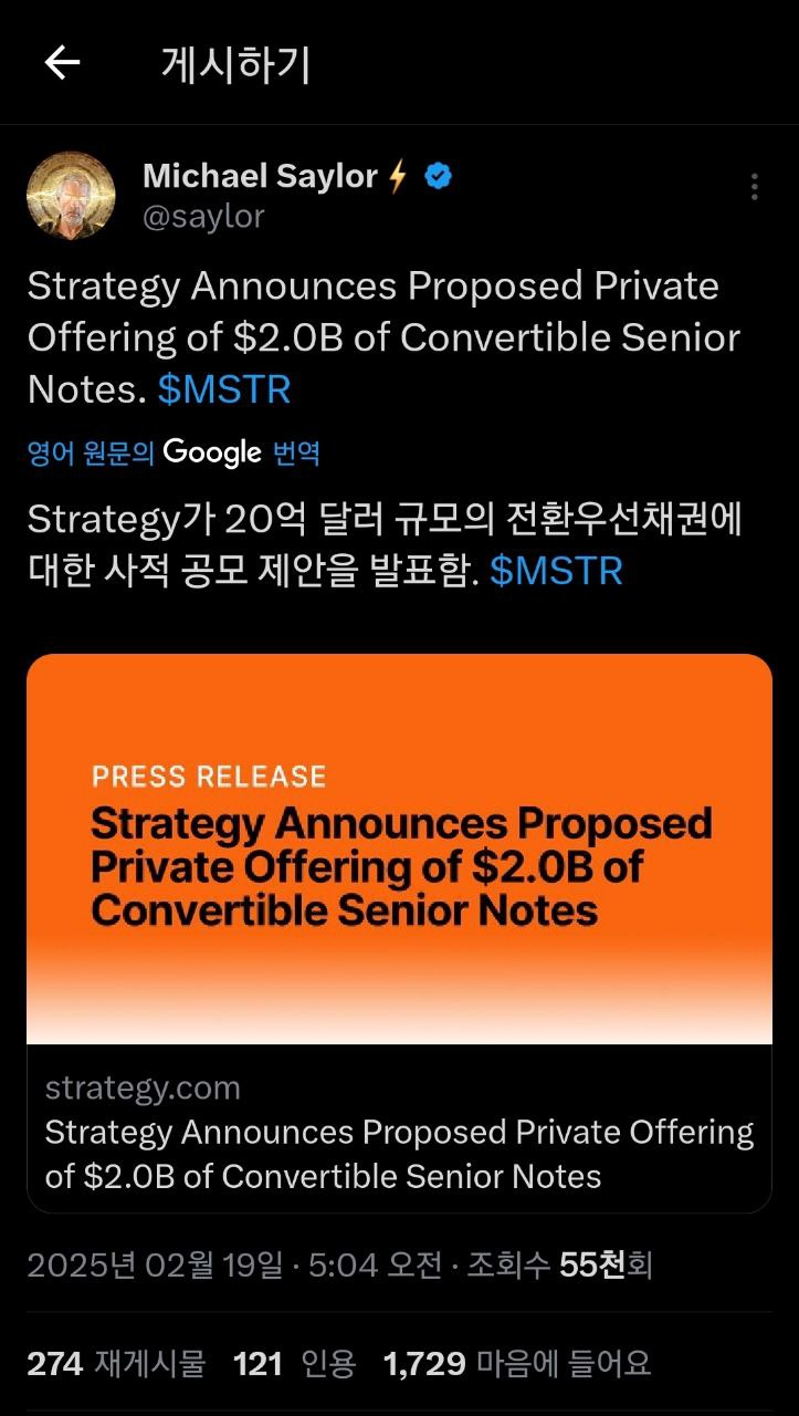 - 스트래티지(구 마이크로스트래티지)가 20억 달러의 자금을 조달해 비트코인을 추가 매입할 계획이라고 발표했다. 기업은 2030년 3월 1일(현지시간) 만기인 0% 전환우선채권 발행을 통해 자금을 조달할 예정이며, 시장 상황 및 기타 요인에 따라 이러한 결정을 내렸다는 설명이다.