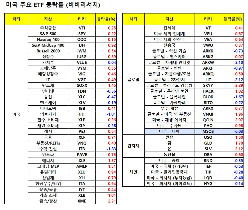 - 마이크론(+7.31%)는 13F에서 드라켄 밀러의 매수 소식, 미즈호가 하반기에 수급 상황이 개선되고 가격이 회복될 가능성이 있다며 메모리 주식을 매수해야 한다고 발표하자 상승.