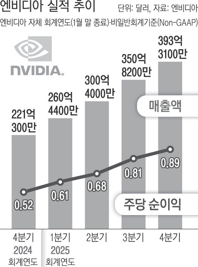 - 엔비디아는 지난 분기(2024년 11월~2025년 1월) 매출 393억3100만달러(약 56조7000억원)와 주당 순이익 0.89달러(약 1280원)를 기록했다고 26일(현지시간) 밝혔다.