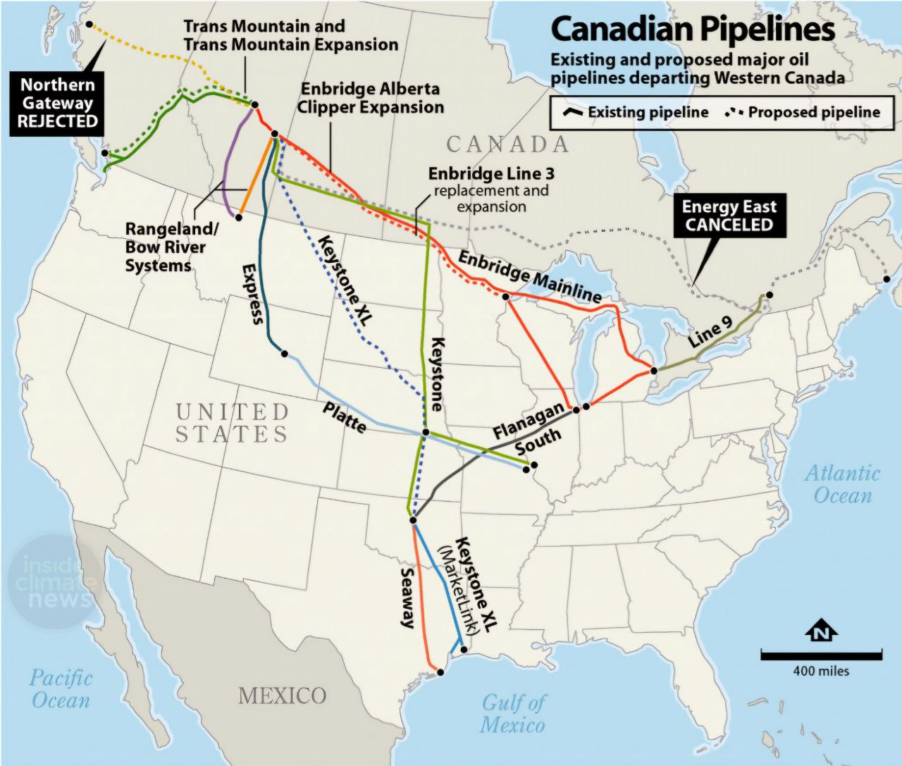 - 캐나다의 모든 원유는 알버타 (i.e. 왼쪽에서 두번째 주)에서 생산되며, 많은 파이프라인이 미국으로 들어갑니다.