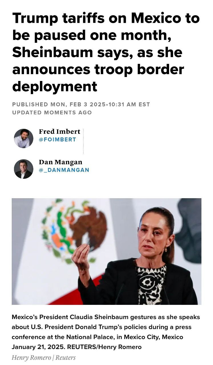- 멕시코 대통령인 클라우디아 세인바움은 미 국경에 1만명의 군인을 보내 밀매 먀악을 관리하고 (아마도 불법 이민자 단속을 도우는 것으로) 약속한 후 트럼프에게 한 달의 관세유예를 받아냈습니다.