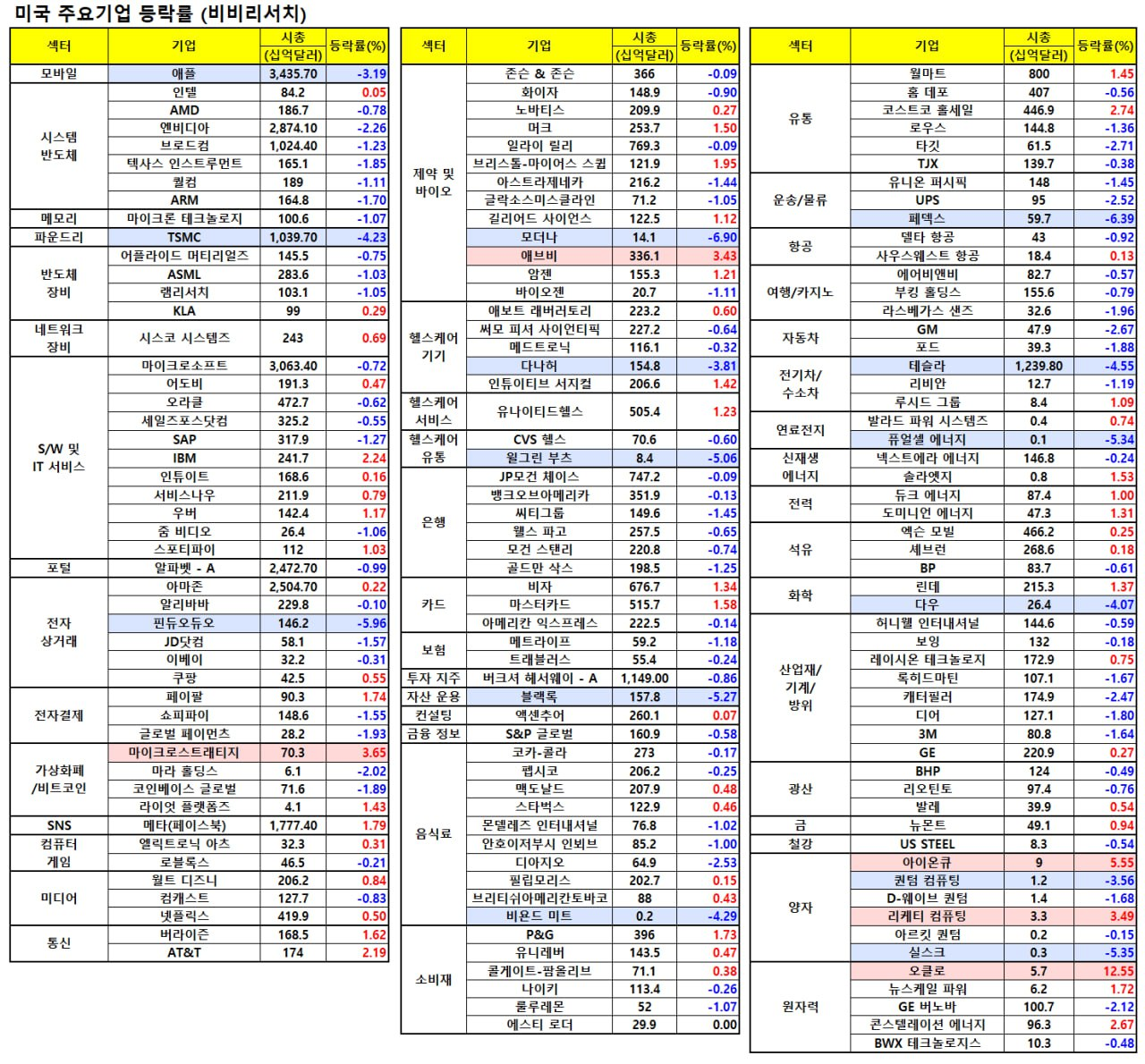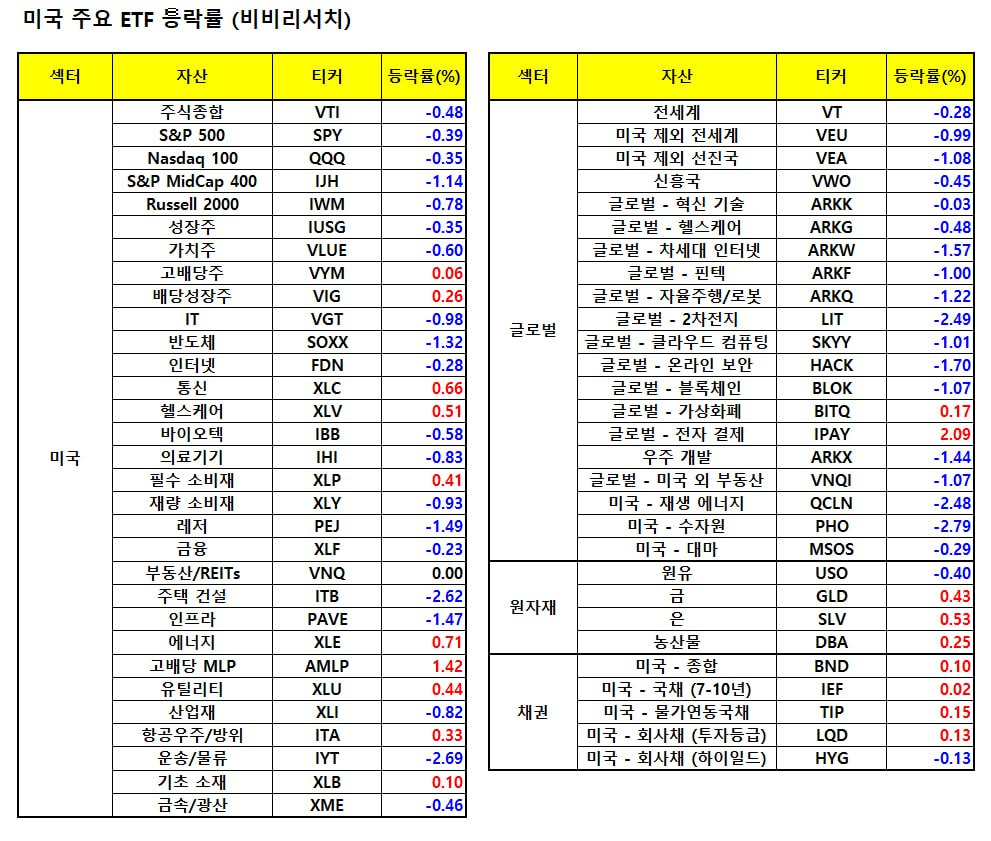 - 브로드컴(-1.67%), 마이크론(-1.45%), AMD(-1.45%), 퀄컴(-1.56%), ASML(-1.12%) 등 대부분 반도체 종목이 하락.