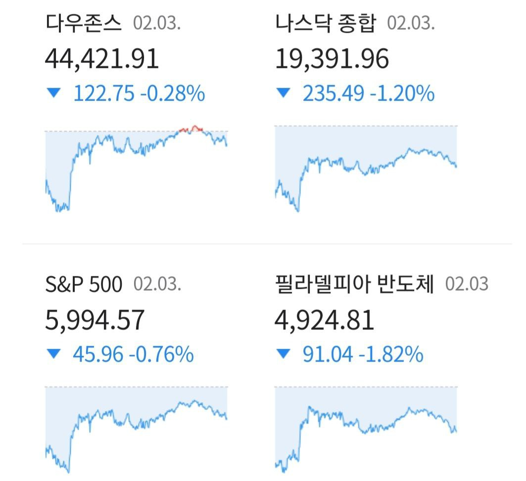 - 미 증시는 트럼프의 캐나다, 멕시코, 중국에 대한 관세 관련 행정명령 소식에 나스닥이 한 때 2.5% 하락하는 등 주식시장은 큰 폭의 하락이 진행.