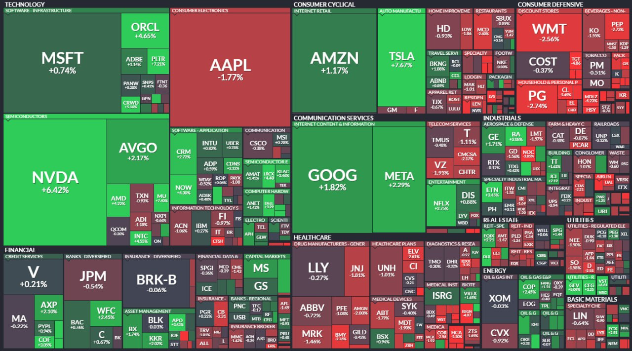 - 기술주 섹터가 강세를 보였고(엔비디아 +6.43%) 임의소비재도 견조한 흐름이었습니다(테슬라 +7.59%)/ 금융업종은 지방 은행이 2% 가량 상승하며 반등했습니다