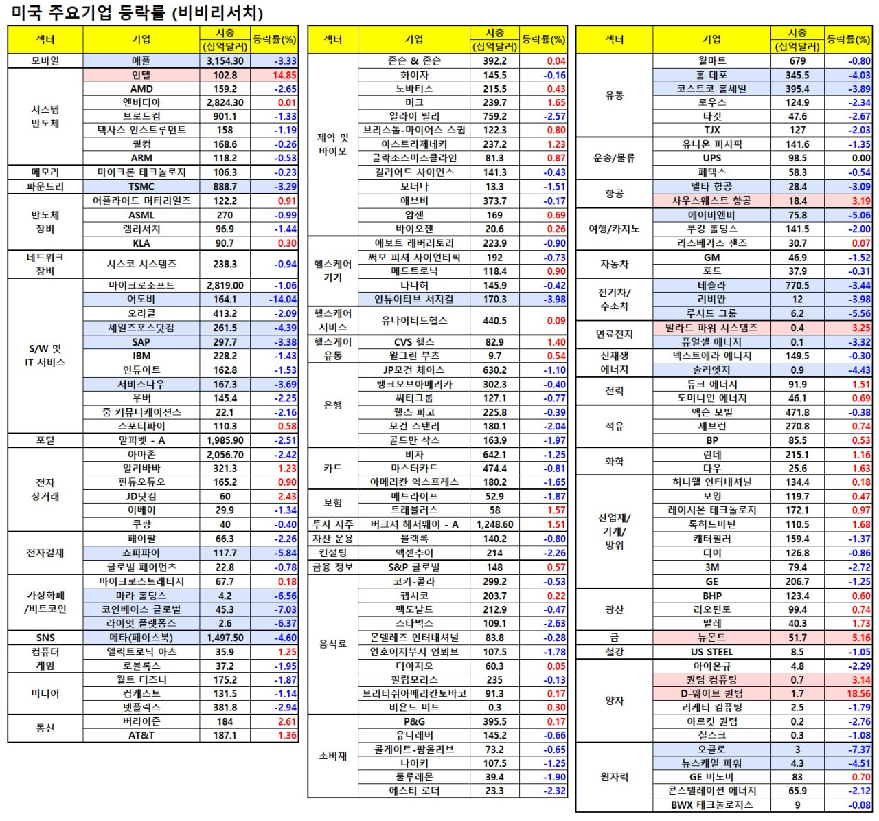 - 어도비(-13.85%)는 기대 매출 부진 여파로 큰 폭 하락.