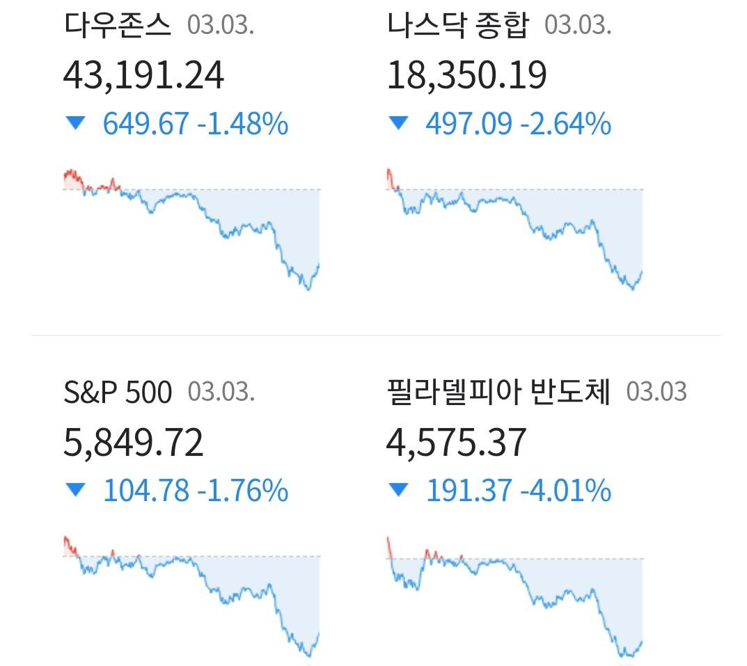 - 이런 가운데 장 마감 앞두고 트럼프가 상호관세를 언급하자 관련 불안이 더욱 확대되며 낙폭이 확대되며 마감(다우 -1.48%, 나스닥 -2.64%, S&P500 -1.76%, 러셀2000 -2.81%, 필라델피아 반도체 지수 -4.01%)