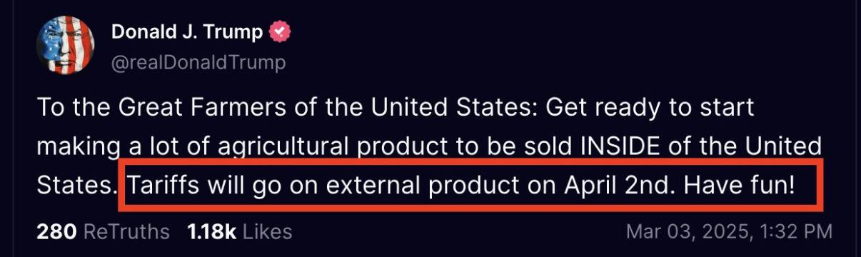 - 이런 가운데 트럼프가 상호관세와 함께 외국산 농산물에 관세 부과를 언급한 점은 무역 분쟁 확대 우려를 더욱 자극.