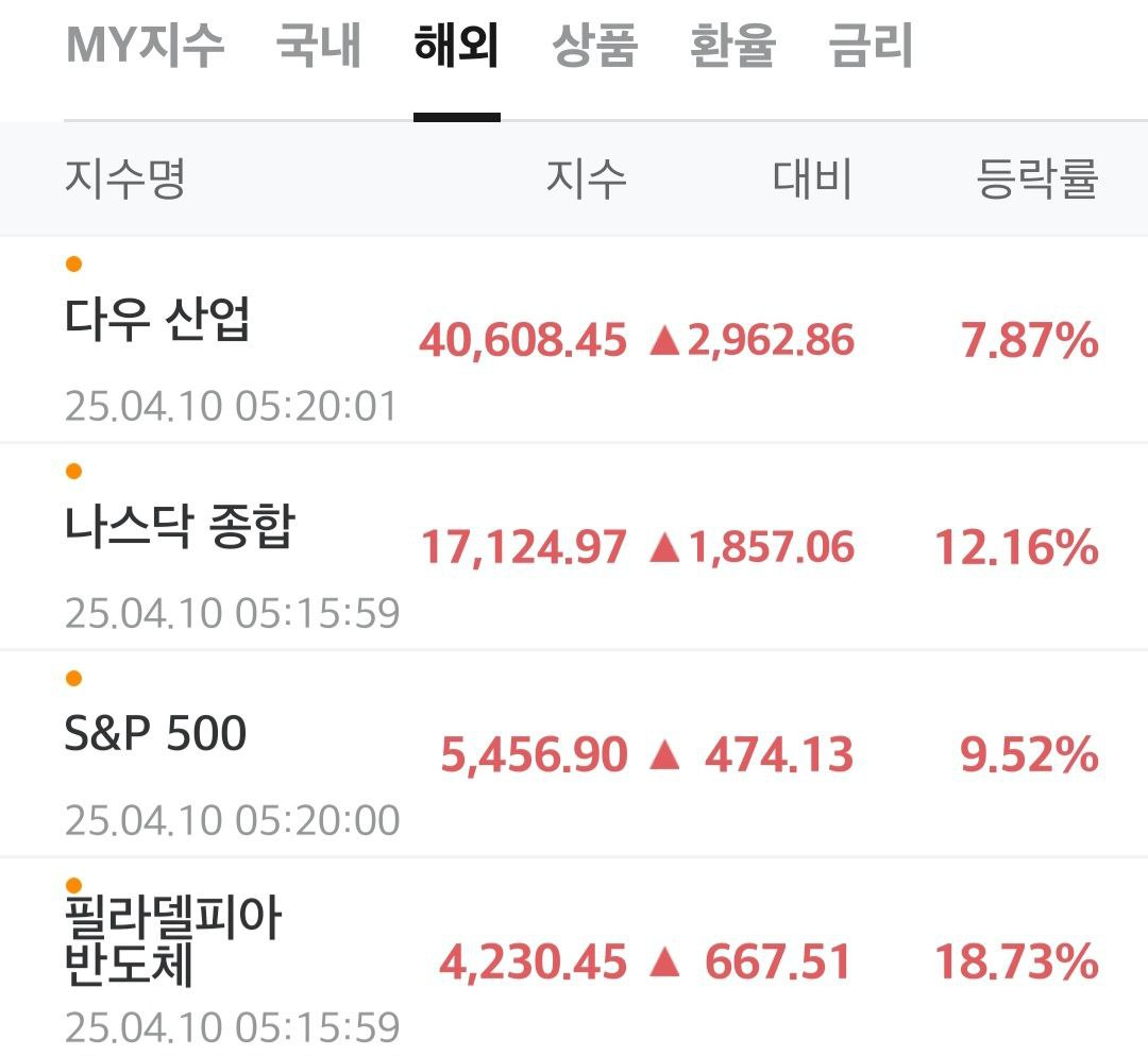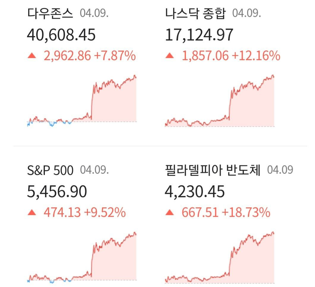 - 04/10 미 증시, 트럼프가 중국 외 국가의 상호관세 90일간 유예에 나스닥 12% 폭등