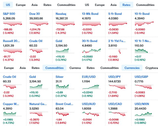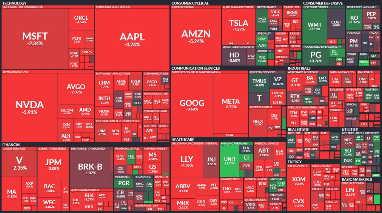 AMD(-8.41%)를 비롯해 브로드컴(-6.94%), 마이크론(-10.04%), TSMC(-4.80%), 퀄컴(-6.40%), ARM(-5.75%), ASML(-5.49%), AMAT(-7.67%)등 대부분 반도체 업종도 동반 하락. 특히 관세 문제로 경기에 대한 불안이 확대된 데 따른 것으로 추정.