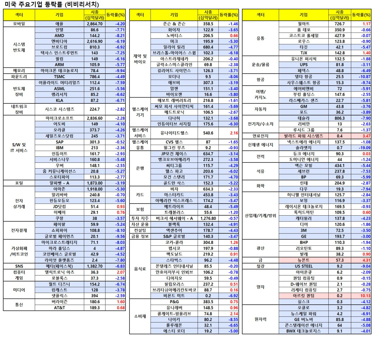 GM(-4.39%), 포드(-3.79%)를 비롯해 스텔란티스(-11.96%), 도요타(-3.97%), 혼다(-3.66%)등 완성차 업체들은 관세 부과에 따른 자재 가격 상승 등 투입비용 증가로 실적 부진 우려가 부각되자 하락.
