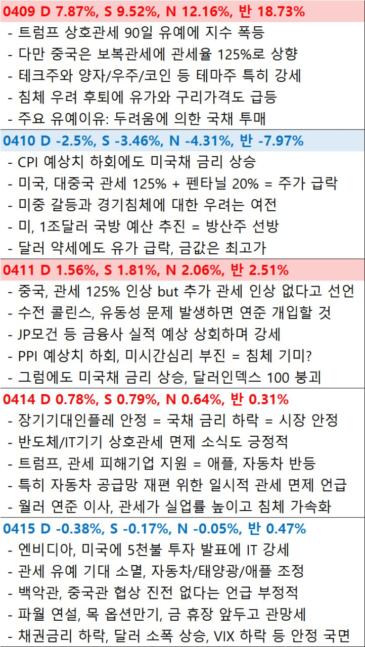 - 대체로 시장은 관세 협상 진행 여부가 국채 금리에 영향을 주고 있으며, 이 결과가 주식시장 변화를 촉발.