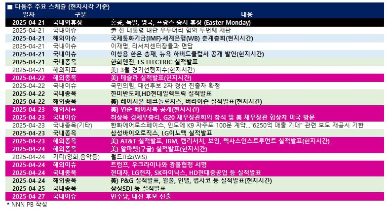 굵직한 경제 지표 발표가 부재한 가운데 본격적인 실적 시즌 시작. 이번주부터 빅테크 실적 발표 시작. 첫 주자로 알파벳과 테슬라. 더불어 보잉, 인텔 등 관세에 직격탄을 받을 기업들의 실적 발표 및 이들의 관세에 대한 언급, 가이던스에 관세가 미칠 영향을 주목할 필요가 있음. - 알파벳 $GOOG, 테슬라 $TSLA, 인텔 $INTC, 보잉 $BA, 서비스나우 $NOW, 펩시 $PEP, 버티브 $VRT, 넥스트에라 에너지 $NEE, GE 베르노바 $GEV, 머크 $MRK, 애브비 $ABBV 등 실적 발표