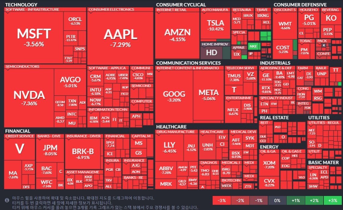 - 04/07 미 증시, 중국의 보복 관세로 거래량 급증 속 패닉셀 발생하며 급락