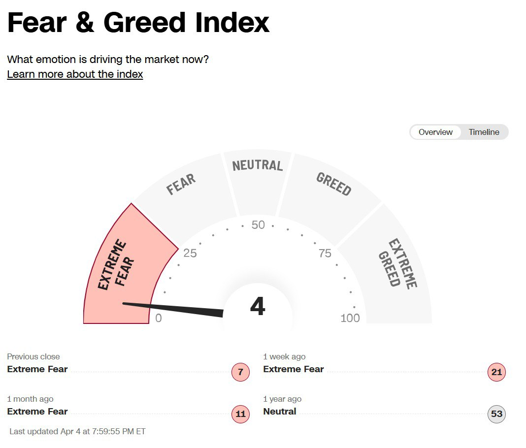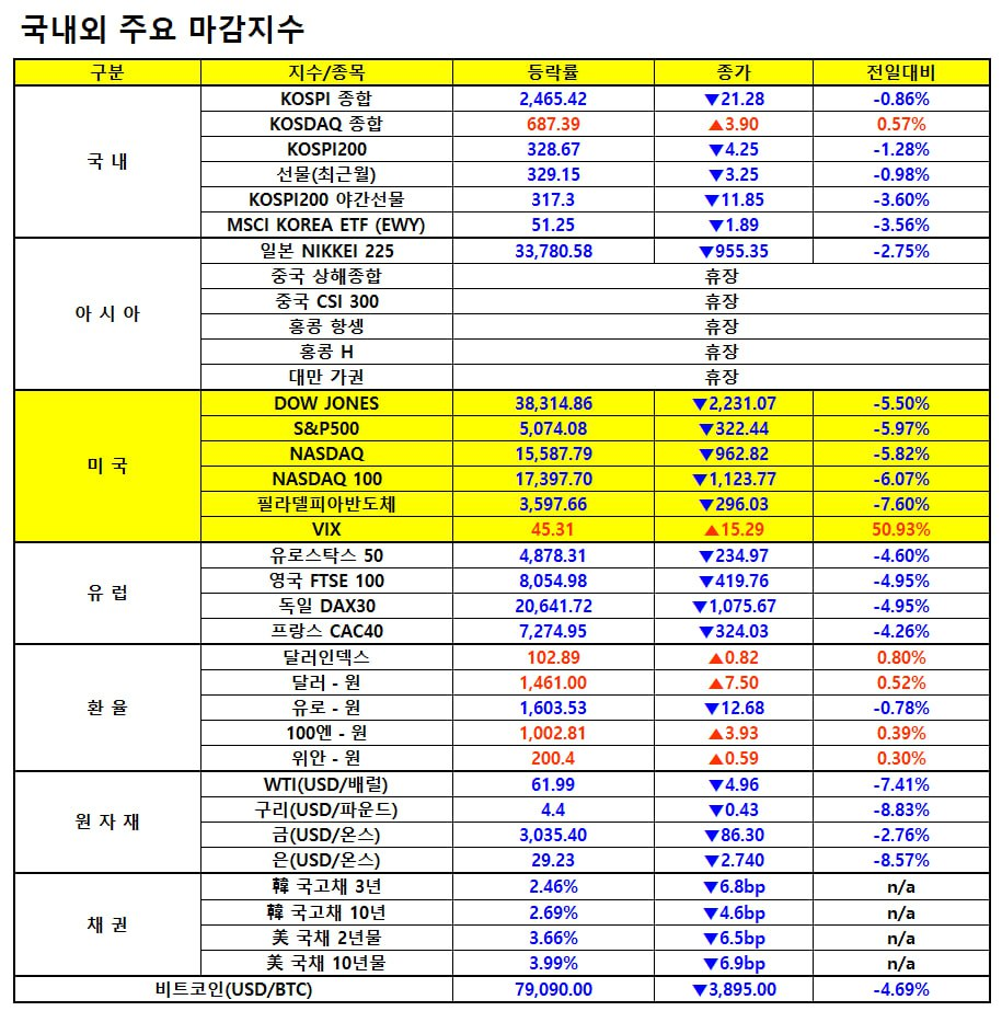 - 미국 증시는 트럼프 대통령이 지난 2일 장 마감 후 예상했던 것보다 훨씬 높은 수준의 상호관세를 발표하자 패닉셀(공황성 매도)에 휩싸였다. 특히 지난 4일엔 중국이 미국의 상호관세 부과에 보복관세로 대응하자 무역전쟁으로 인한 경기 침체 우려가 심화되며 매도세가 더욱 강화됐다.