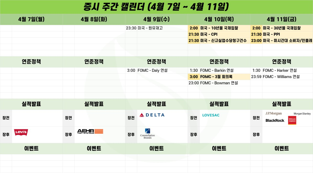 - > 실적발표 : AEHR (화) Delta Airlines, Constellation Brands (수) JPMorgan, BlackRock (금)
