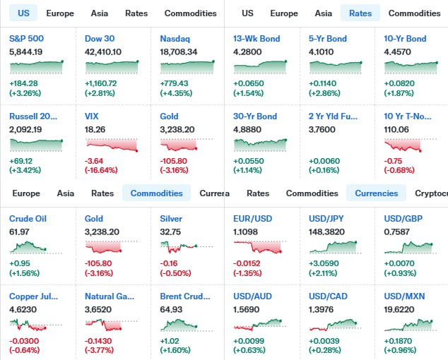 - - 다우존스 2.8% 상승, S&P500 3.3% 상승, 나스닥 4.3% 상승.