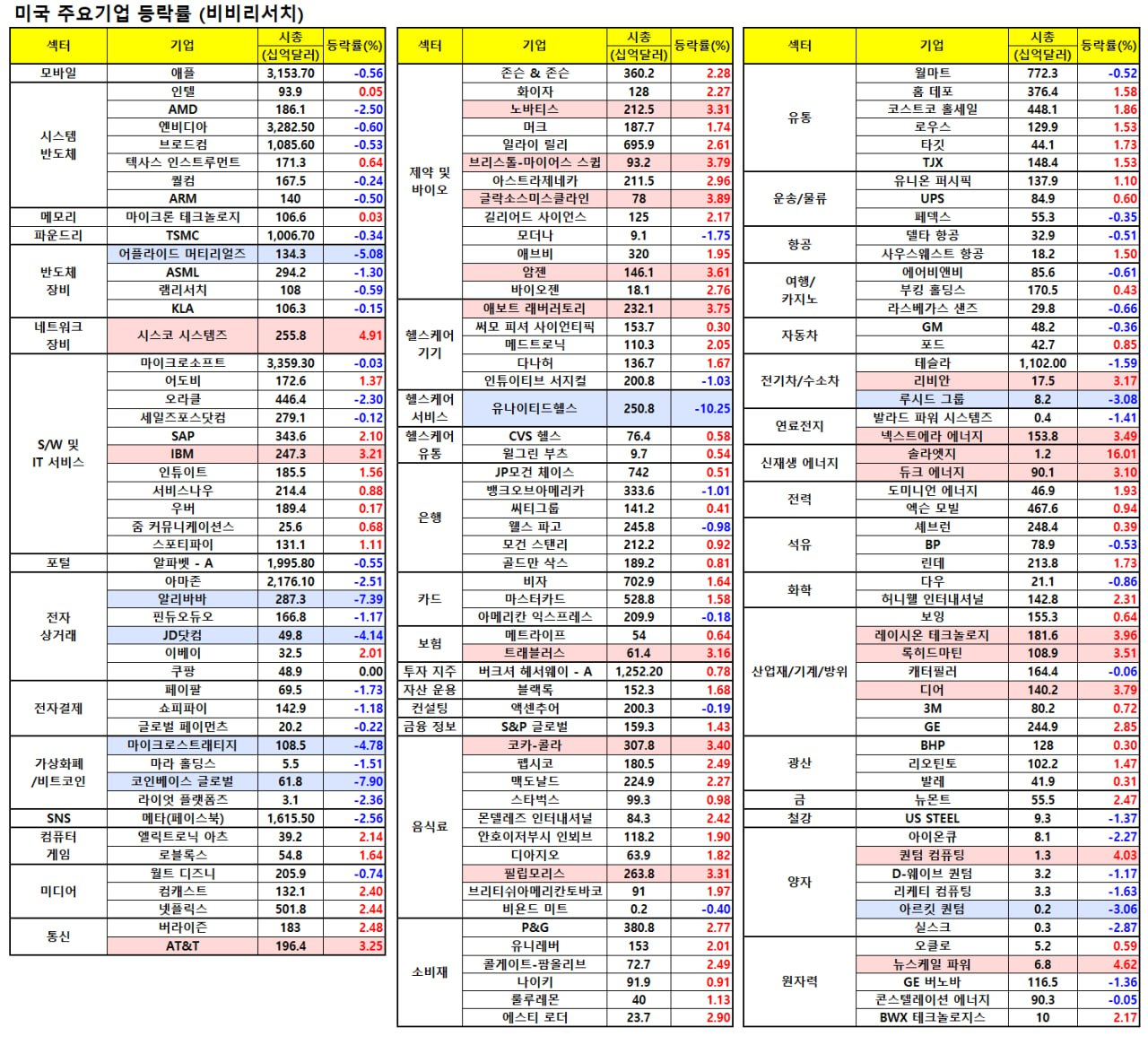 - 아마존(-2.42%)은 월마트(-0.50%)가 실적 발표 후 제품 가격 상승 압력을 언급하자 하락.