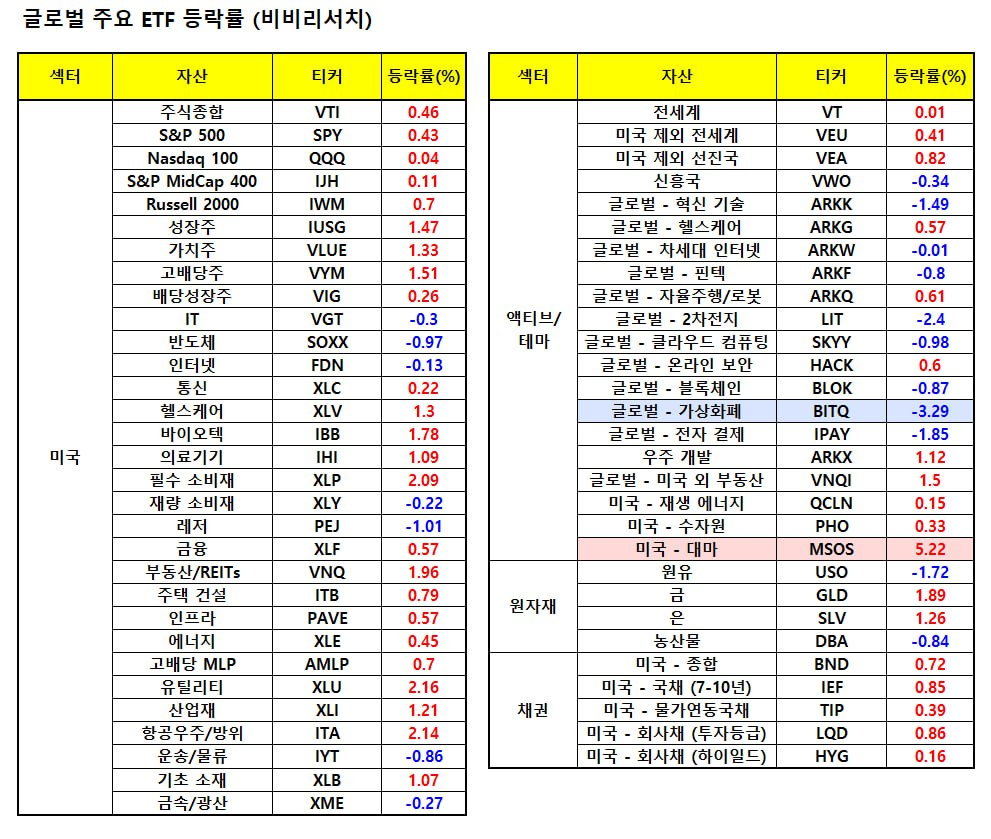 - 일라이릴리(-2.48%), 노보노디스크(+2.70%), 암젠(+3.59%)등 제약 업종은 최근 하락에 따른 되돌림이 유입되며 상승. 더 나아가 소매판매와 산업생산 등이 부진하자 경기 방어 성격도 제약주 강세 요인.