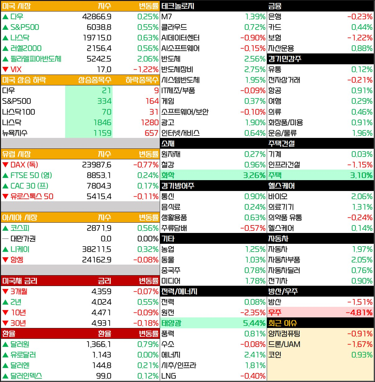 - [미·중 무역회담 진전, TSMC발 AI 낙관론, OpenAI의 구글Cloud 계약, 테슬라 상승 등에 힙입어 상승 마감했습니다]