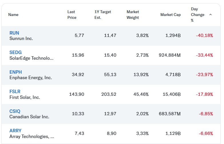- 미 상원의 태양광 세액 공제 조기 종료 법안 의안에 태양광 기업들 큰 폭으로 하락