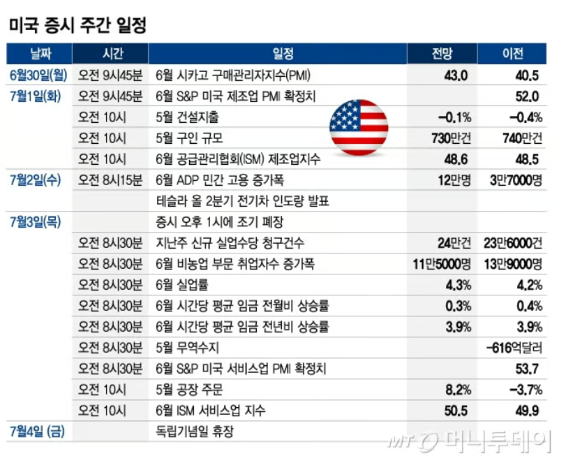 - 오는 7월3일에는 미국 노동시장의 상태를 가늠하게 해주는 6월 고용지표가 발표된다.