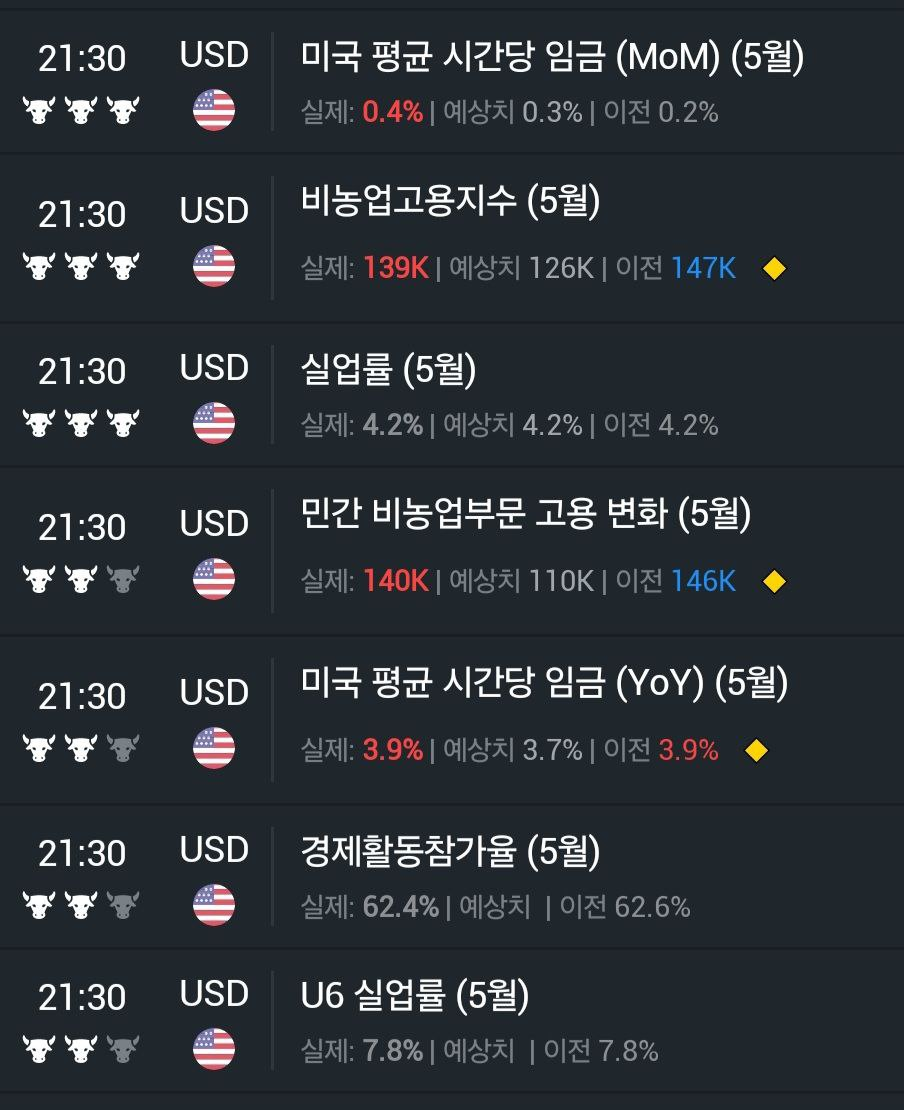 - 금일 오전 발표된 5월 비농업 일자리가 전월 대비 13만9천명 증가했다고 발표되며 시장 예측치를 상회함.
