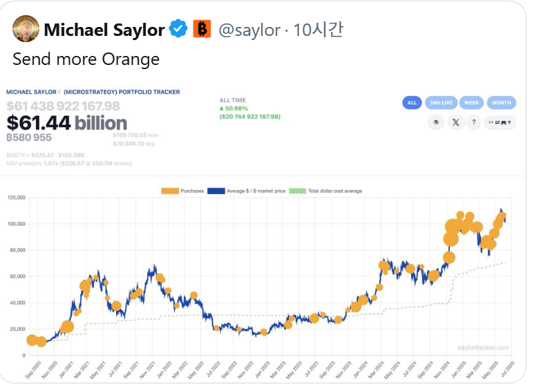 - 기업 의 BTC 보유는 단기 투기보다는 장기적 확신을 반영, 전체 시장이 성숙해지고 있다는 신호 - 마이클세일러, 스트래티지 의 추가 비트코인 매수 신호-MichaelSaylor, 8주 연속으로 비트코인 매입 전 포트폴리오 트래커를 공유
