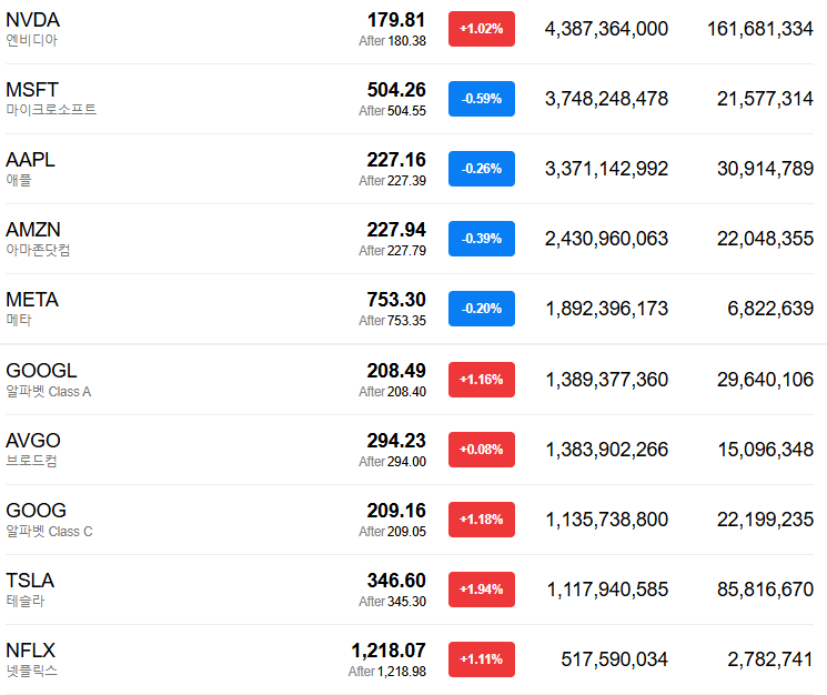 - 시가총액 상위 기술주 가운데서는 엔비디아가 1.0% 오른 것을 비롯해 브로드컴(+0.1%), 구글 모회사 알파벳(+1.2%), 테슬라(+1.9%), 넷플릭스(+1.1%) 등이 강세를 보임.