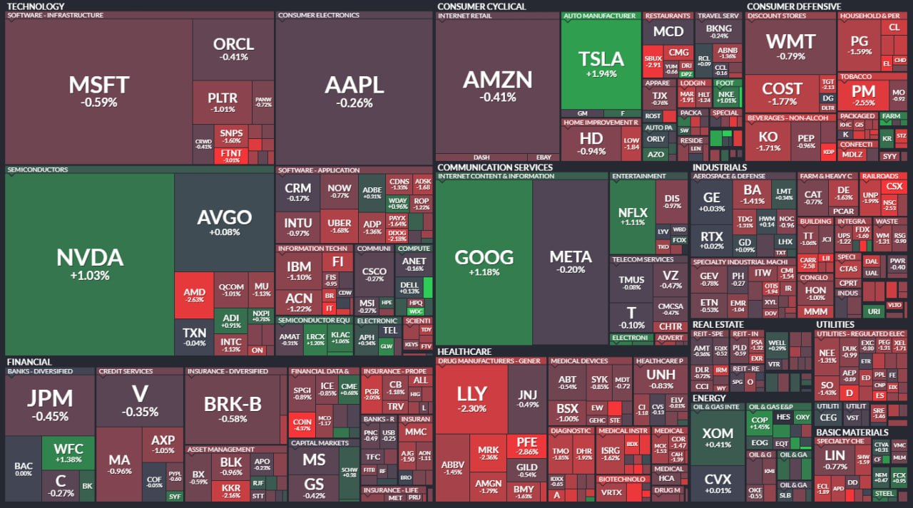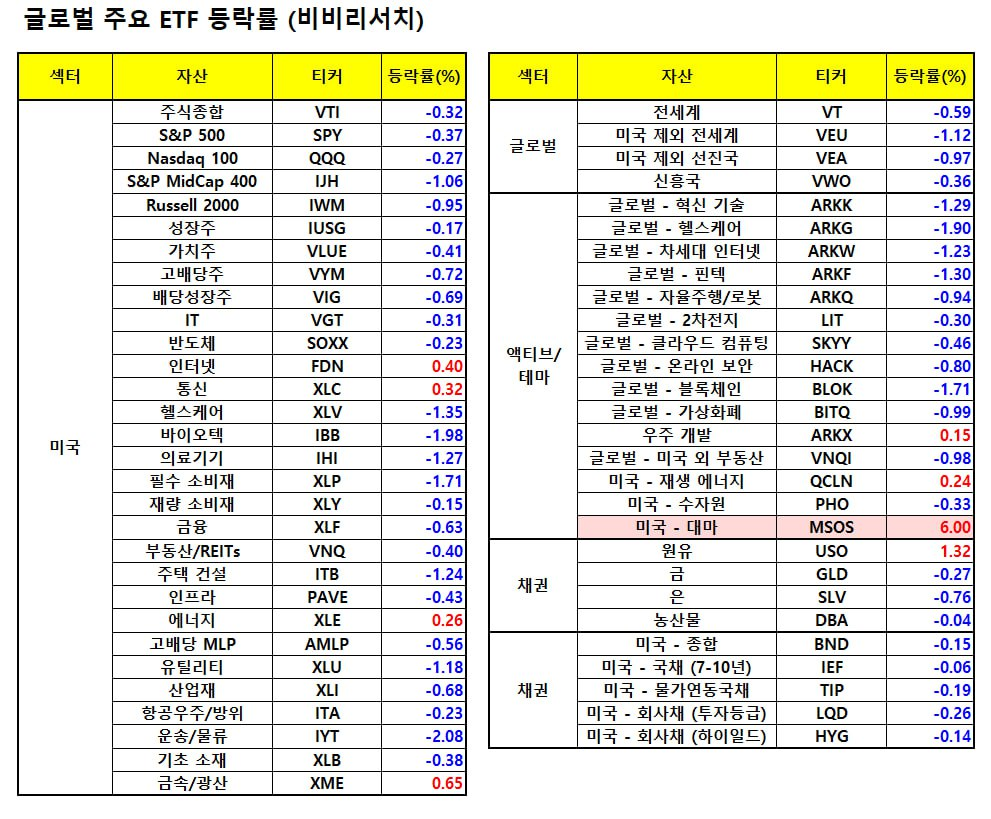 - 마이크로소프트(-0.6%), 애플(-0.3%), 아마존(-0.4%), 메타(-0.2%)등은 하락 마감함.
