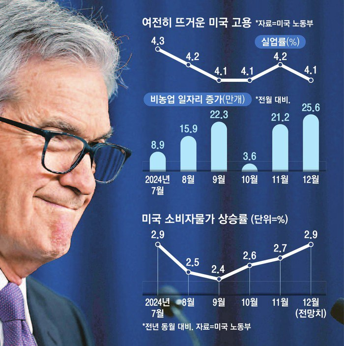 - 미국의 지난해 12월 고용동향에서 노동시장이 활황이어서 인플레이션이 자극받을 것이란 우려가 높아지자 트럼프 2기 행정부의 고물가와 이에따른 연방준비제도(연준)의 금리 인상 우려까지 고개를 들고 있다.