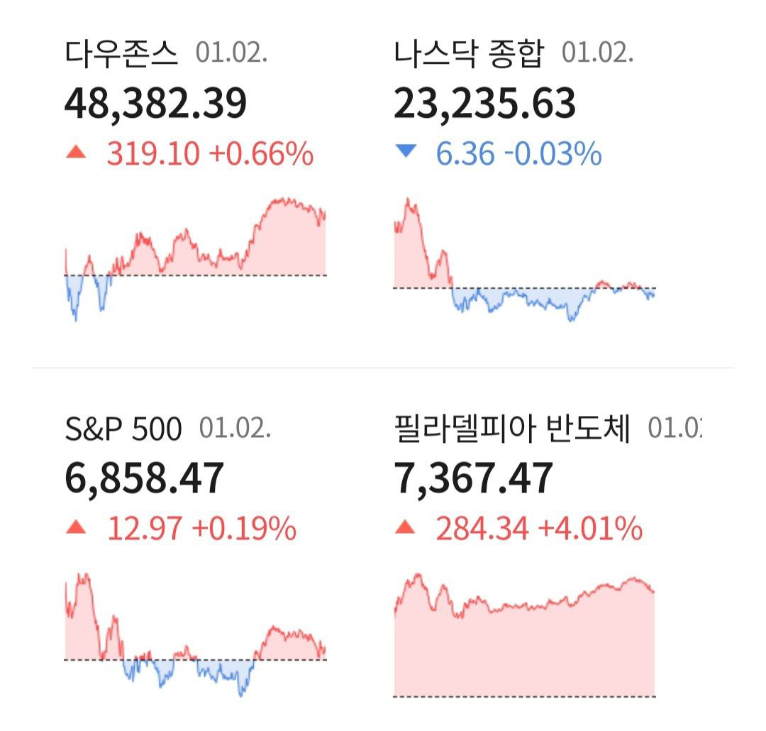 - 026년 첫 거래일 3대 지수 + 러셀 2000 혼조. 나스닥만 약보합. 러셀 2000 강세