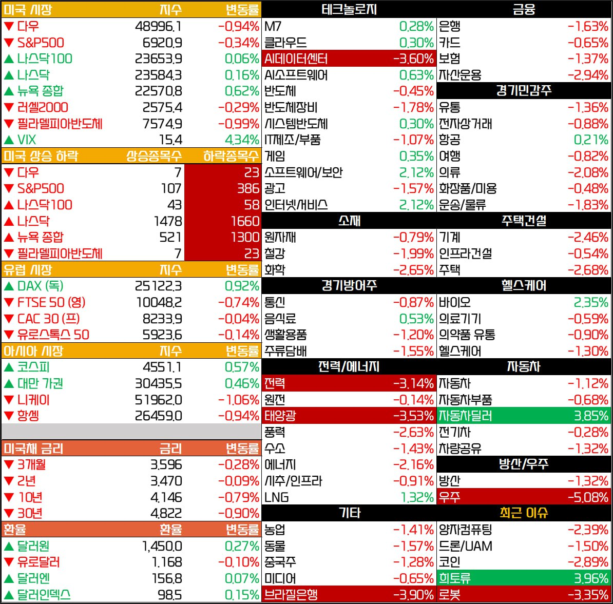 - 그러나 장 후반 트럼프의 기관투자자 단독주택 매입 금지, 방산 기업 주주 환원 제한 발언이 규제 리스크로 확대되며 상승 축소 및 낙폭 확대(다우 -0.94%, 나스닥 +0.16%, S&P500 -0.34%, 러셀2000 -0.29%, 필라델피아 반도체 지수 -0.99%)