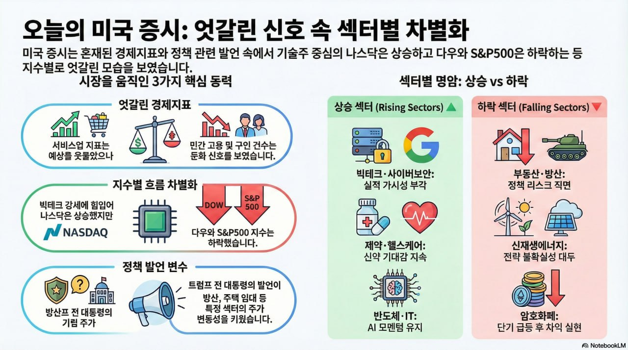 - 미국 증시는 혼재된 경제지표와 정책 발언 속에서 지수별로 차별화된 흐름을 보이고 있다.