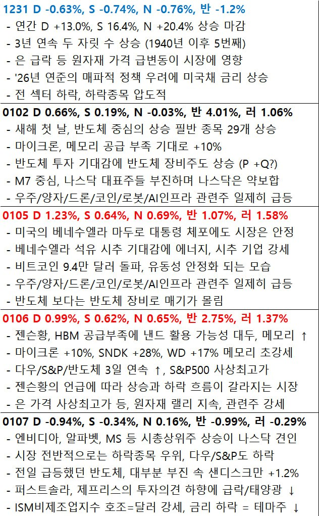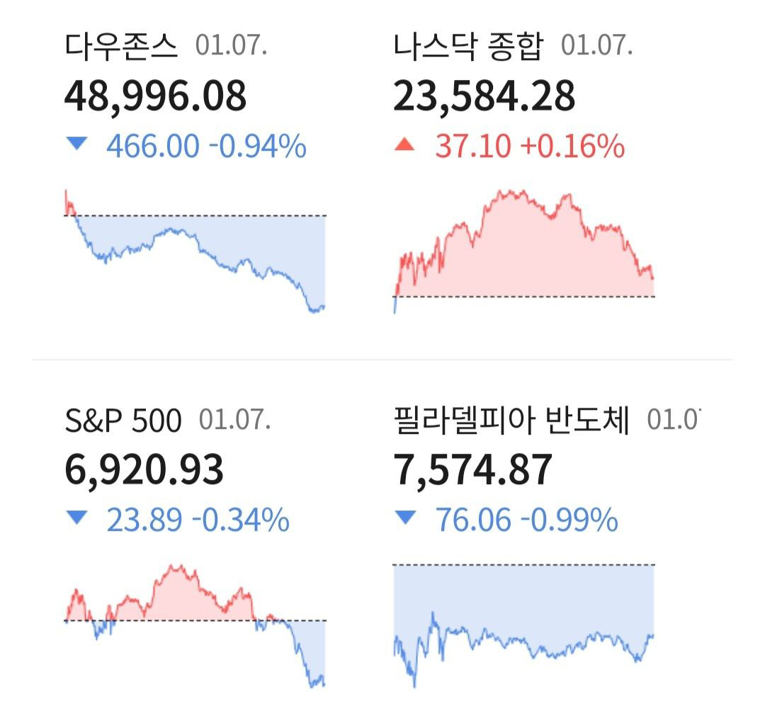 - 팔란티어(+1.10%)는 베네수엘라 작전에 깊이 관여했을 가능성이 높다고 시장의 분석 보도 등이 이어지며 상승. 다만 트럼프의 방산 업종 규제 언급에 상승 일부 축소. 정부 사업 시 규제 이슈가 부각된 데 따른 결과. 시간 외로는 트럼프의 방위비 인상 언급에 1% 상승 중.