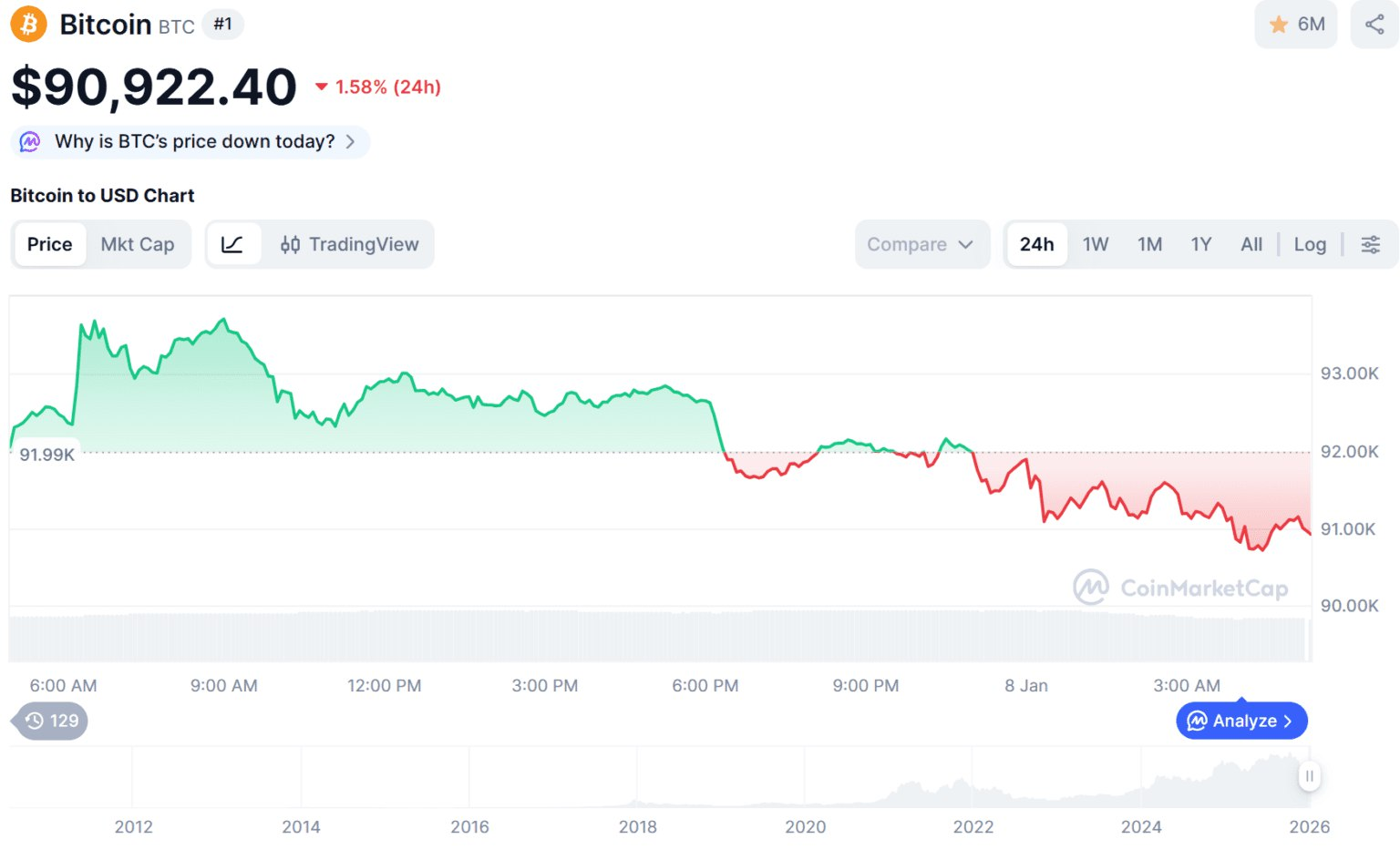 - 비트코인(BTC)은 최근 랠리가 약화되면서 9만1,500달러 선까지 하락했으며, 이는 고점 대비 1.12% 하락한 수준임.